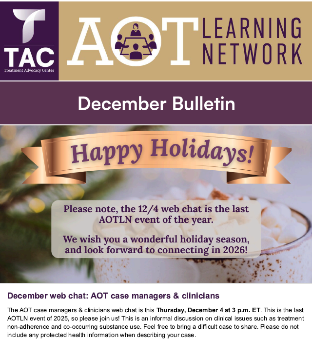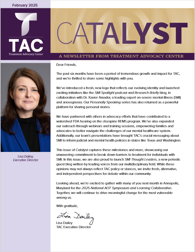TAC statistics are cited frequently in media reports, and our subject matter experts routinely consult with journalists to provide nuance and context to reporting on SMI. We encourage public discourse on mental illness to include the most ill.