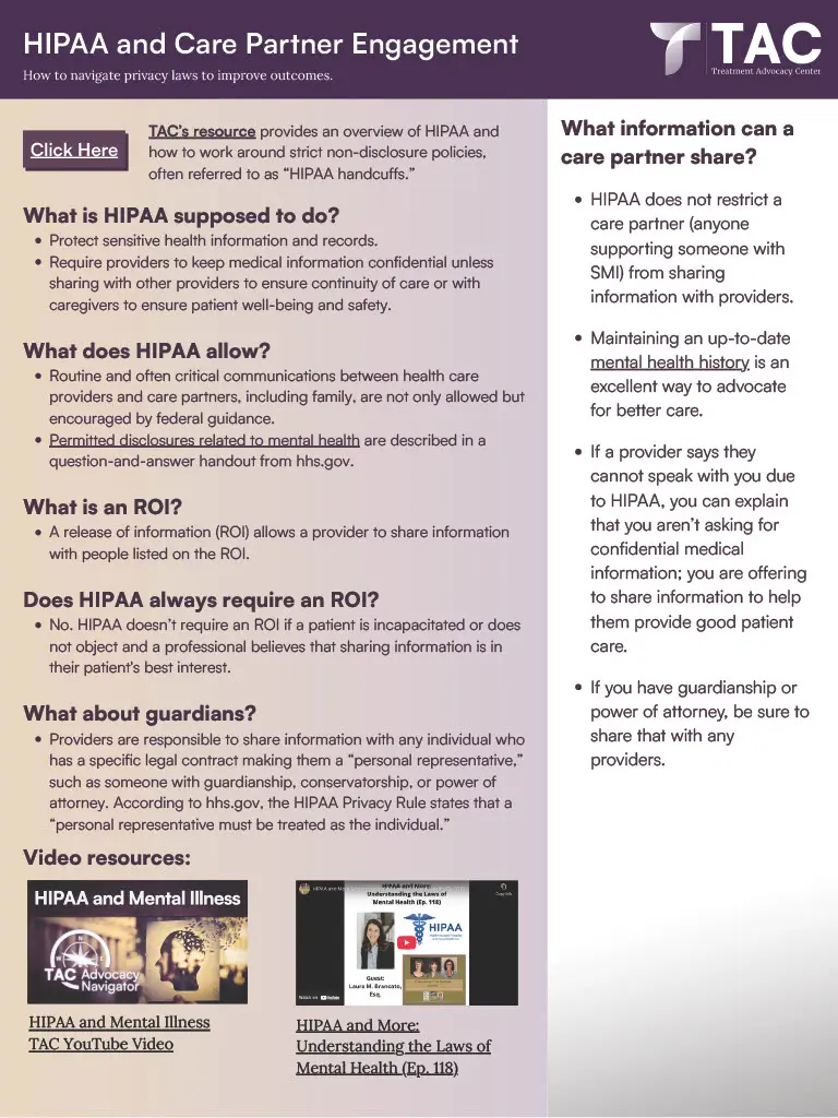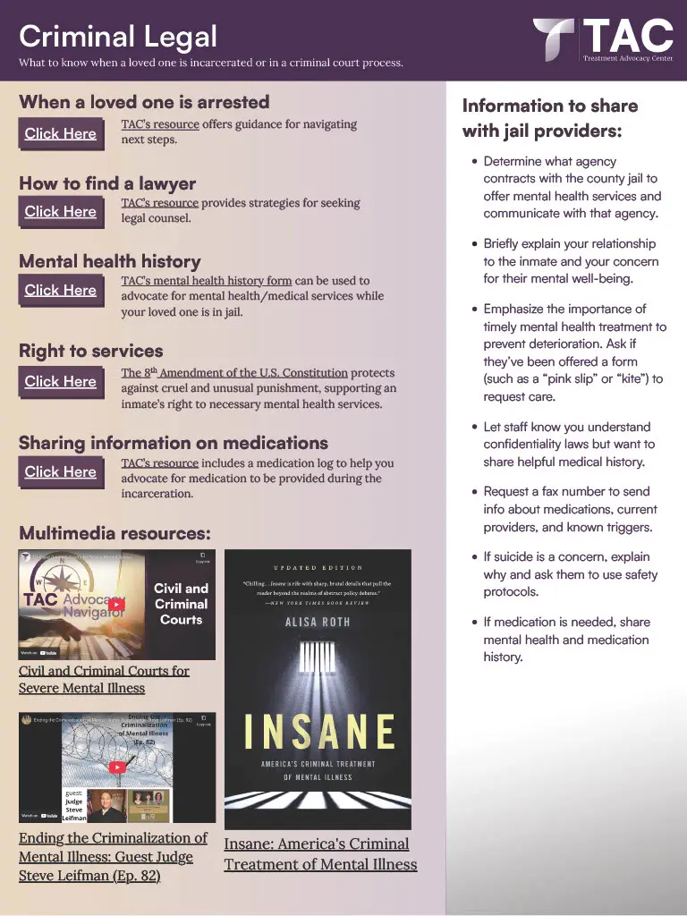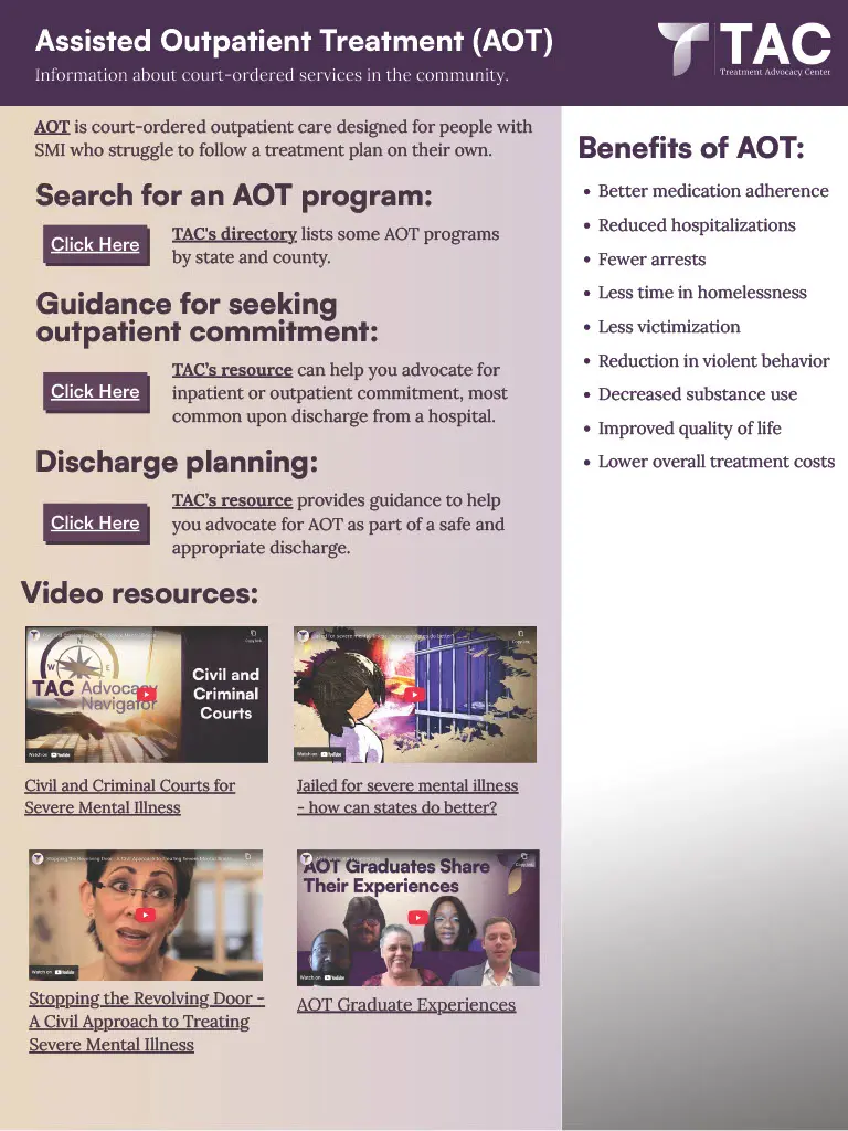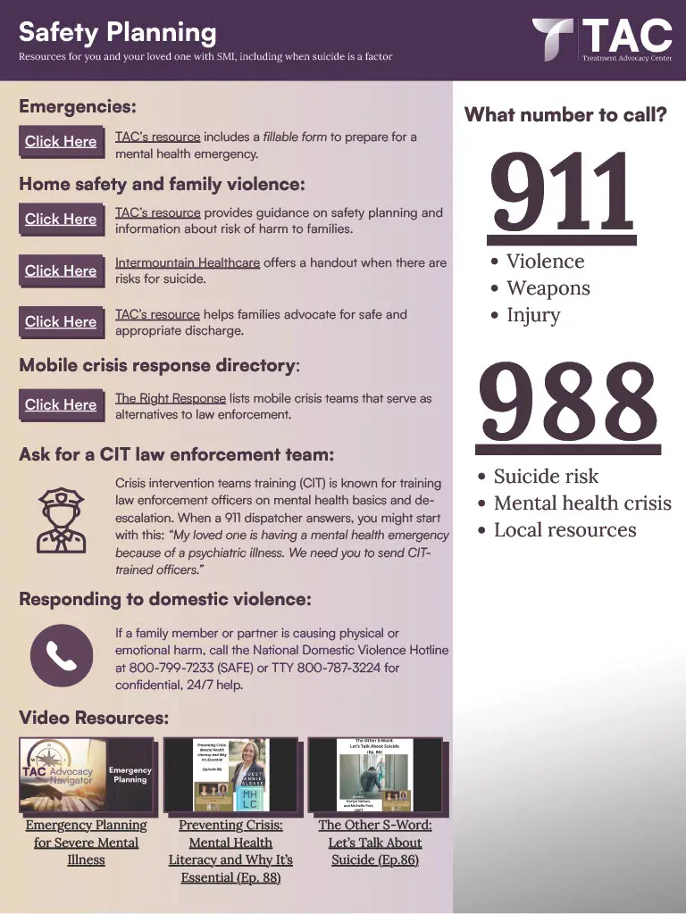 In the documents shared on this page, we provide our top information, links, and resources to help with some of the most common challenges in understanding and navigating treatment for severe mental illness (SMI). Click on any of the images to open the full pdf document.